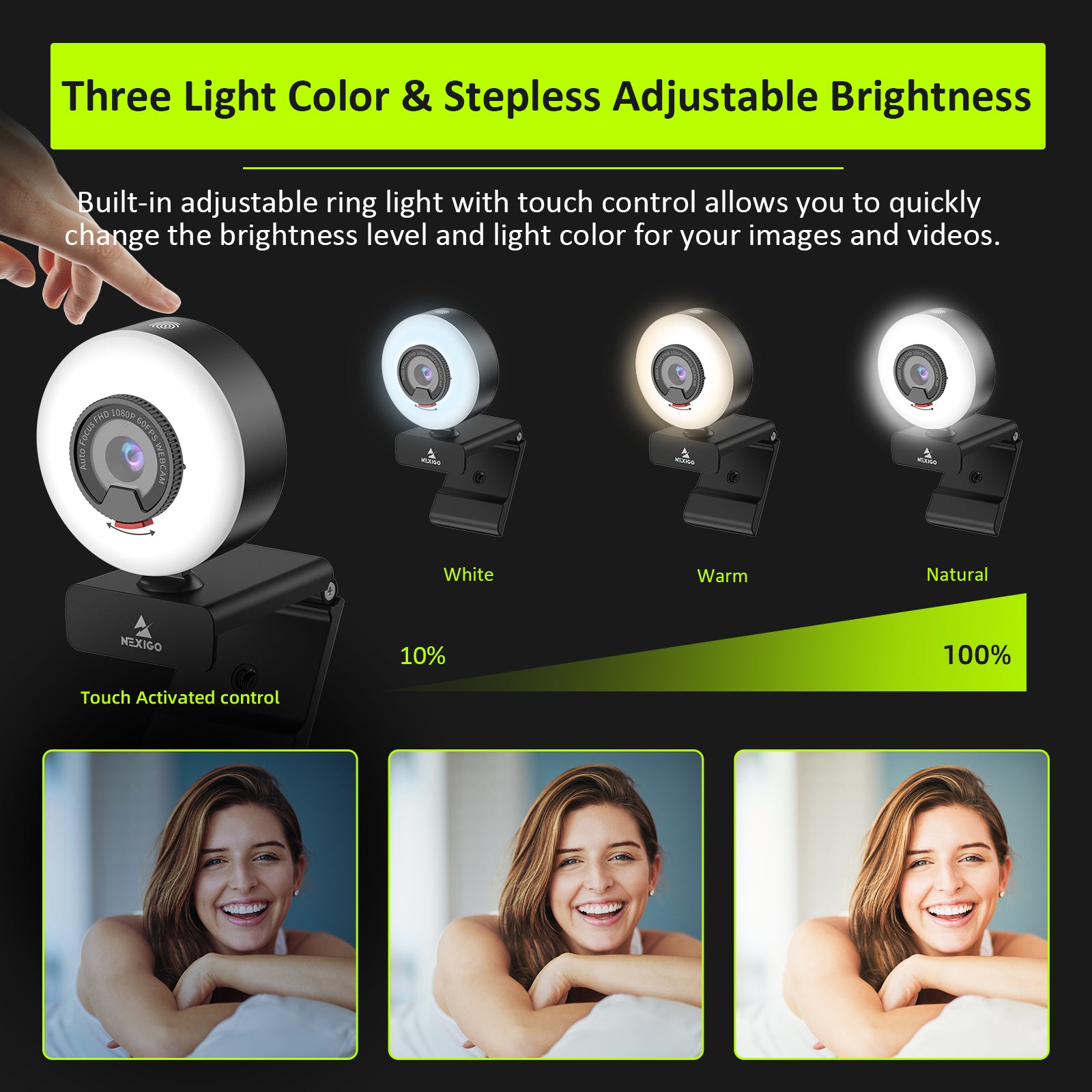 NexiGo N960E 1080p Webcam 60 FPS Adjustable Ring Light Dual Stereo Microphone Black